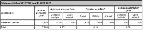 Madame le Maire présente le patrimoine total des réseaux pour le calcul de la RODP 2023 dont le détail figure au tableau ci-dessous :